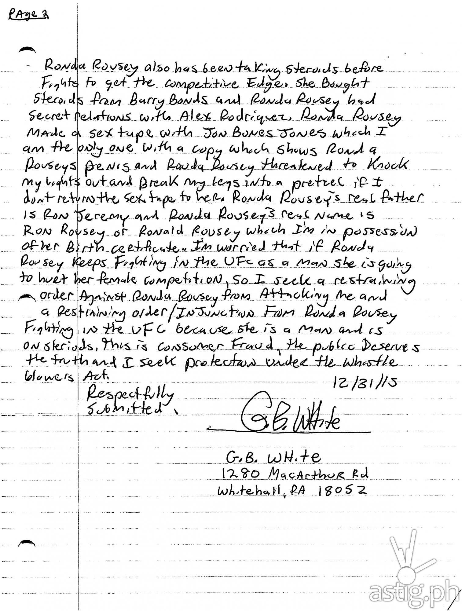 The document then gets weirder and weirder, with claims that White has evidence of Ronda Rousey in Speedos showing her penis at a Nudist Colony in Dewey Beach Delaware.