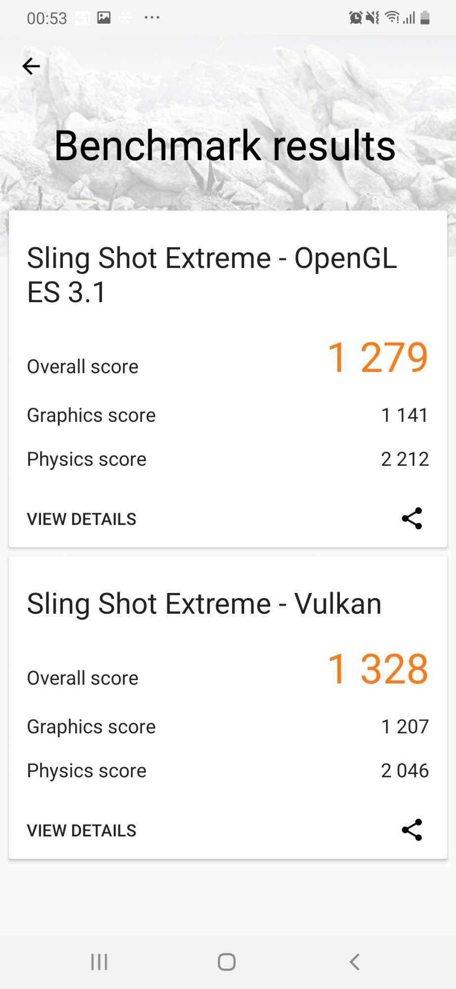 - 3DMark SlingShot Extreme: 1279 (OpenGL ES 3.1); 1328 (Vulkan)