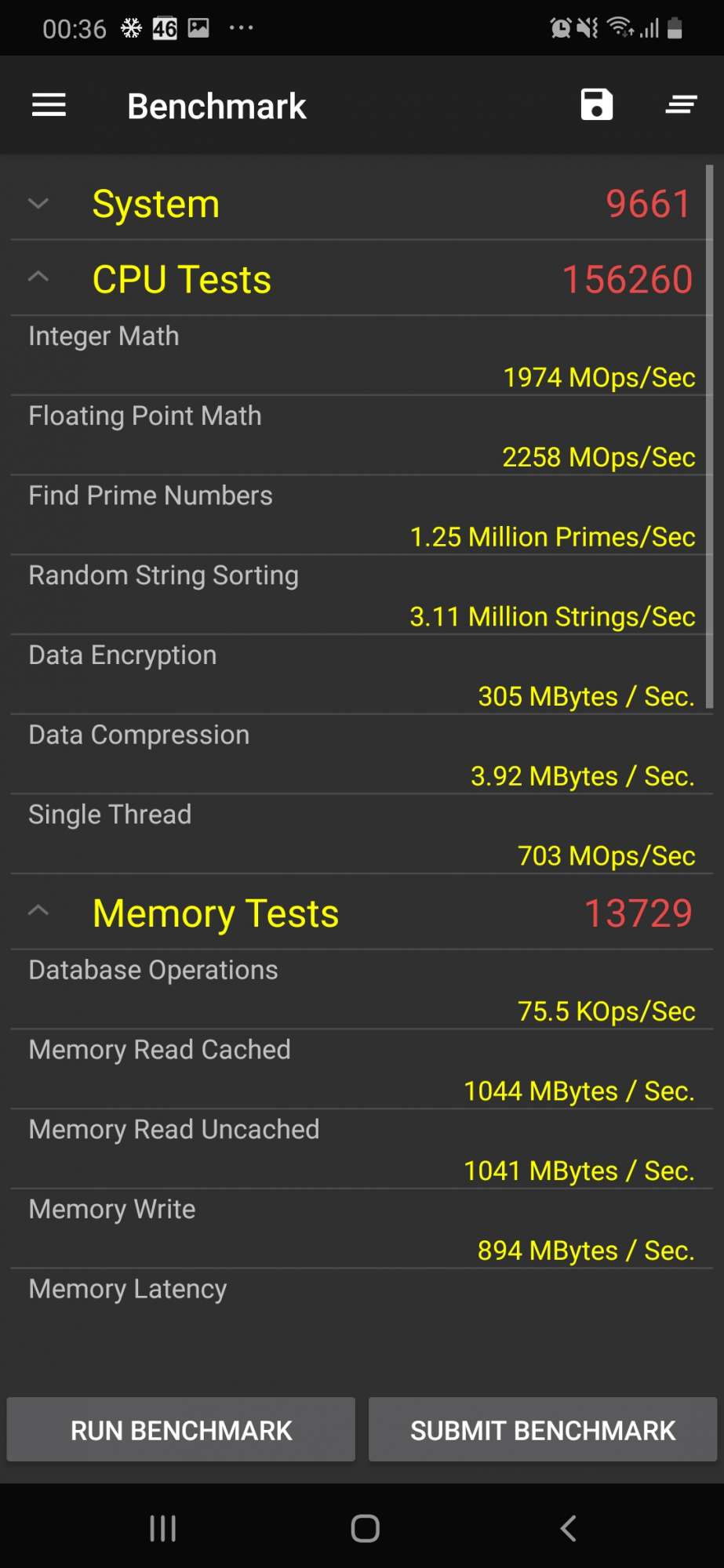 - Passmark: 9661 (system); 156260 (CPU); 13729 (memory); 60568 (disk)