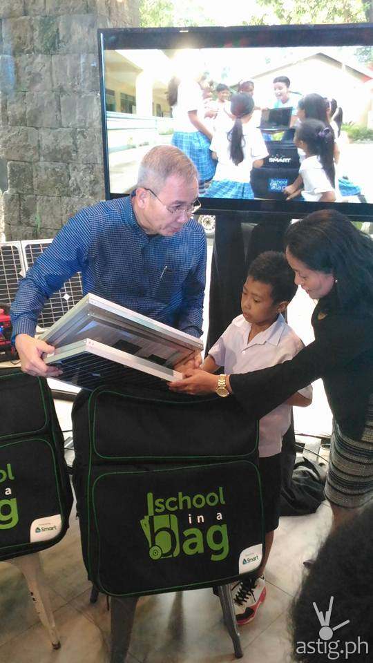 Representative of mobile leader Smart Communications went to remote area and donate a learning tool package called School in a Bag. This contains a solar panel for electricity, a laptop, a mobile phone, a pocket Wi-Fi with starter load, LED TV and learning modules.