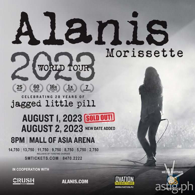 On March 22, 2023, Ovation Productions announced the Manila concert of Alanis Morissette to finally be set on August 1, 2023, at Mall of Asia Arena but due to high demand, DAY 1 is sold out and we are adding a new date on August 2, 2023.