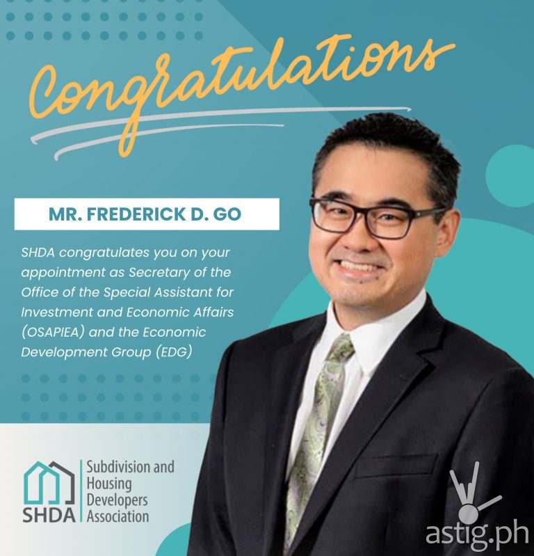 The Subdivision and Housing Developers Association (SHDA) Inc., the leading organization of housing and real estate developers in the Philippines, lauds the appointment of Mr. Frederick D. Go, CEO of Robinsons Land Corporation, as head of the Office of the Special Assistant to the President for Investment and Economic Affairs (OSAPIEA).