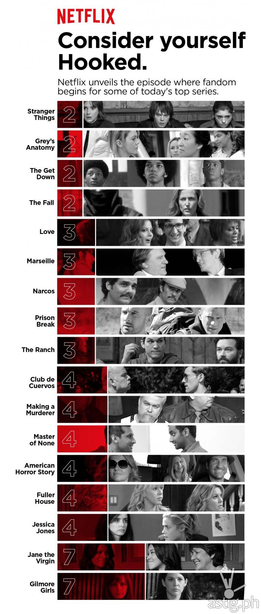 While there’s some consistency around how fans around the world get hooked on episodes, there are some interesting viewing behaviors found among fans in the Philippines. For example, Filipino viewers easily get hooked early on with shows that allow them to live vicariously through law-breaking characters featured in shows such as Breaking Bad, Better Call Saul, How to Get Away with Murder, and Narcos. Filipinos also prefer a long brew for their dose of superhero justice with Marvel’s Daredevil and Marvel’s Jessica Jones.