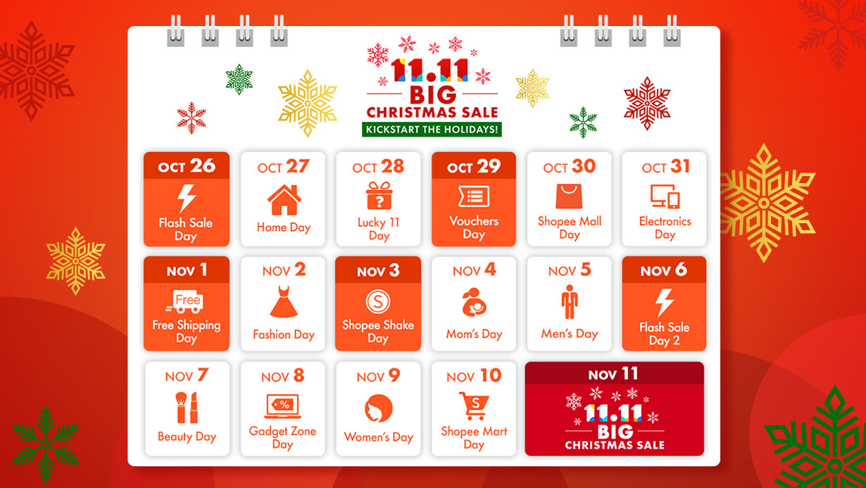 • 11 Flash Sale Day happening on October 26 and November 6 featuring 9 windows of upsized flash deals, and a bonus Free Shipping with no minimum spend for flash deals