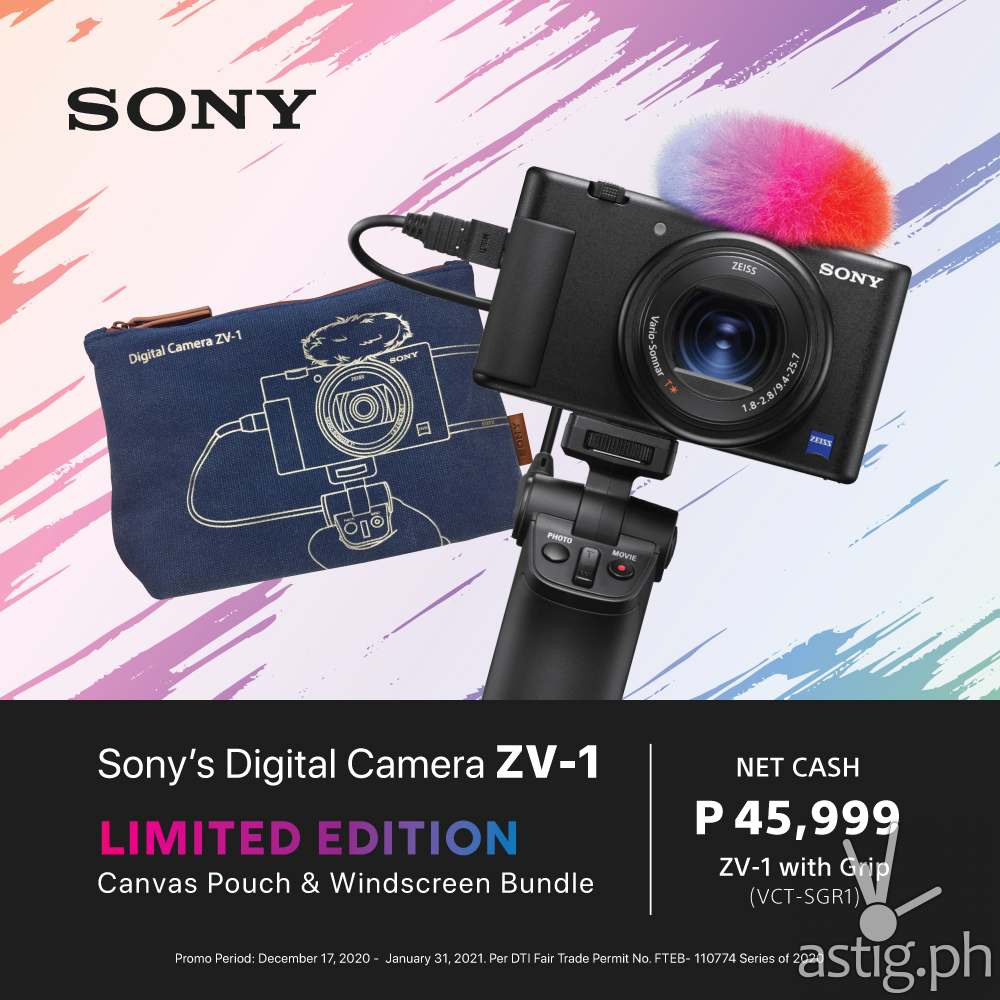 If you’re into casual videos and you’d want to level up your TikTok game, Sony’s digital camera ZV-1 packaged with VCT-SGR1 shooting grip currently includes a FREE limited-edition canvas pouch and multi-colored windscreen.