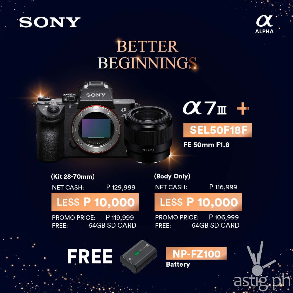 Been planning to go full-frame? Don’t miss this chance because Sony’s Alpha 7 III’s retail price is at P10,000 off. Its kit package (includes a 28-70mm lens) is now priced at P119,999 and its body is now only P105,999. The bonus? Both packages include a FREE SEL50F18F lens, 64GB SD Card, and an NP-FZ100 battery!