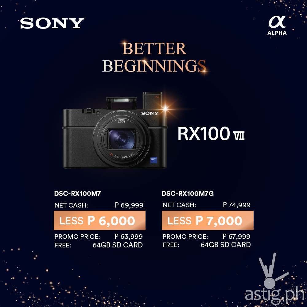 If you’re looking for something more compact, Sony’s compact point-and-shoot Cybershot cameras are perfect for on-the-go recording like the DSC-RX100M7G and DSC-RX100M7 that slashes P7,000 and P6,000 off its original prices, respectively with a FREE 64GB SD Card.