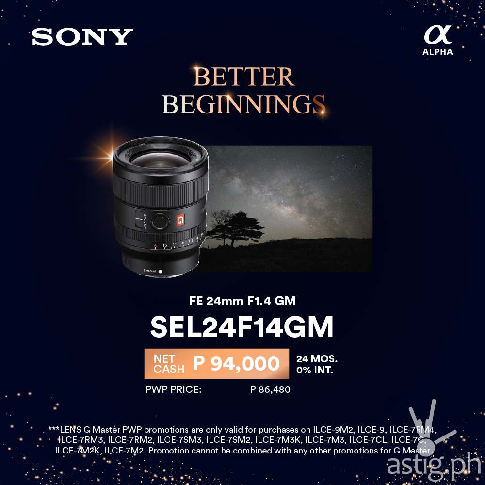 Been wanting to upgrade to a premium lens? This is the perfect time with Sony’s special deals on select G Master models. One of Sony’s in demand portrait lenses, the SEL24F14GM is on a discounted price of P86,480 when you purchase it together with select Alpha cameras. You may opt to purchase the lens alone and pay up to 24 months at 0% interest.
