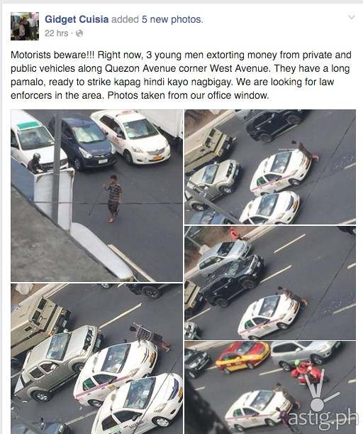In her Facebook post, she said “Motorists beware!!! Right now, 3 young men extorting money from private and public vehicles along Quezon Avenue corner West Avenue. They have a long pamalo, ready to strike kapag hindi kayo nagbigay. We are looking for law enforcers in the area. Photos taken from our office window.”