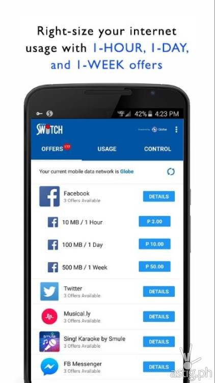 Globe Switch is designed with three main functions: OFFERS, CONTROL and USAGE. Under Offers are the best app deals that are only exclusive within Globe Switch. These deals are ready for download, ideal for those new to navigating online and using mobile data. Users can freely try and purchase these deals at a more affordable price. Globe Switch is your gateway to more than 3 GB worth of access to over 50 of the most popular apps.Purchases are conveniently charged to ones prepaid load, while some apps are permanently FREE to explore.