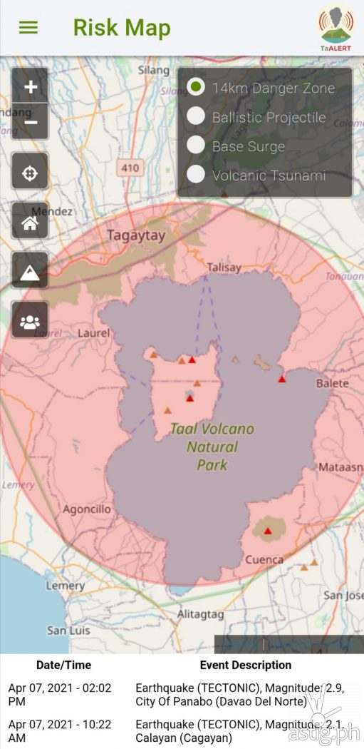 TaALERT is equipped with a real-time updated map that shows the user’s location relative to confirmed volcanic activity. Reflecting Phivolcs’ published hazard zones, the in-app map allows users to see how far they are from a potential hazard, keeping users informed on what is happening at the moment, and helping them decide on whether evacuation is necessary.