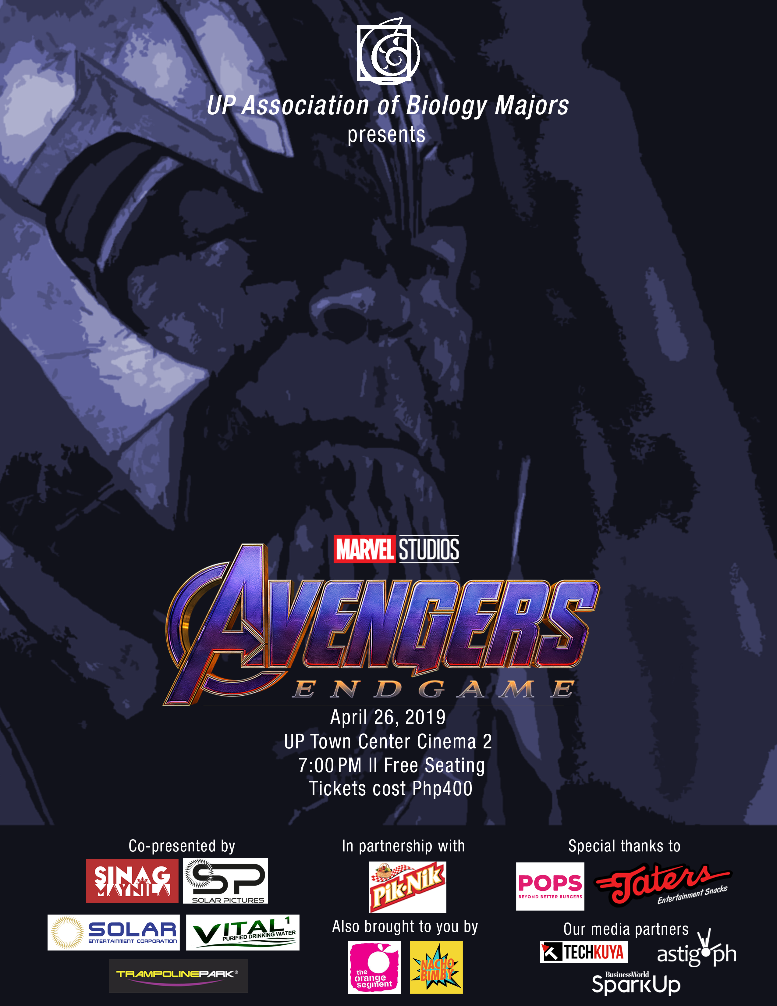 The UP Association of Biology Majors, together with Trampoline Park Philippines, Sinag Maynila, and Vital Purified Drinking Water, bring you a block screening of: “Avengers:...