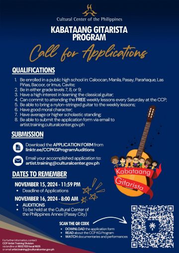 The Cultural Center of the Philippines (CCP) is now accepting applications for Batch 12 of the CCP Kabataang Gitarista (KG) Program. A project of the...