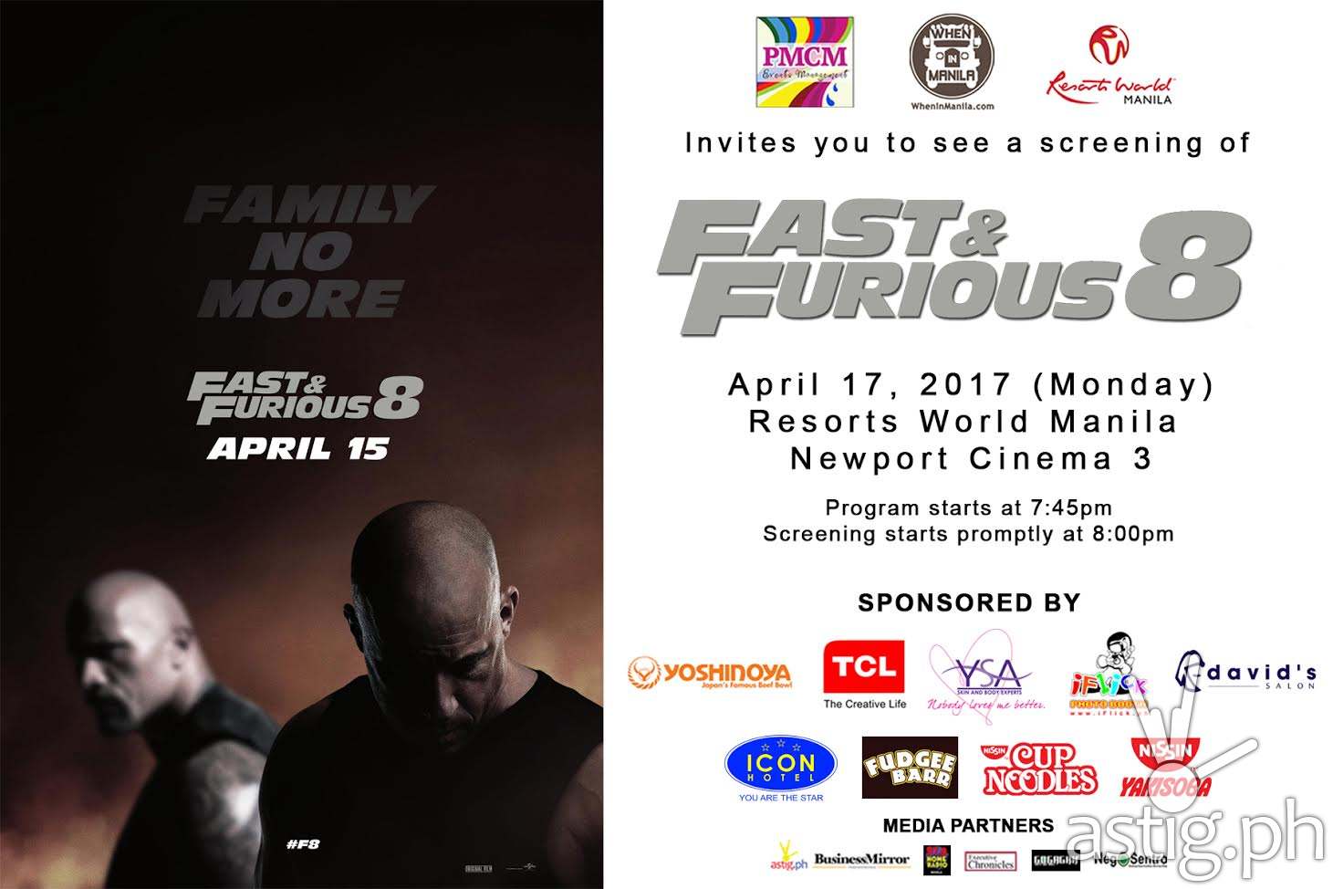 PMCM Events and When In Manila will be holding a special screening of Fast and Furious 8 on 5PM April 17 at Resorts World Manila....