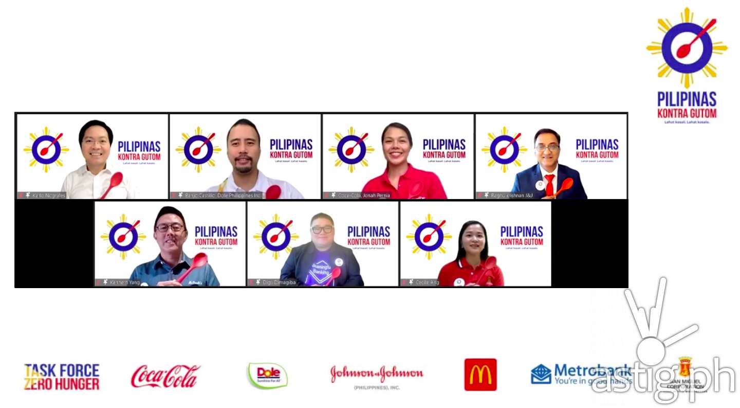 Lahat kasali, lahat kasalo. Task Force Zero Hunger Chairman, Sec. Karlo Nograles, launches Pilipinas Kontra Gutom – a multi sectoral movement behind Task Force Zero Hunger which aims to eradicate hunger in the country. Joining him in the launch are the founding members from the private sector. Top row (from left): Task Force Zero Hunger Chair Secretary Karlo Nograles, Dole Philippines General Manager Banjo Castillo, Coca-Cola’s Director for Public Affairs and Sustainability Jonah Pernia, Johnson & Johnson Philippines President and Managing Director Raghu Krishnan. Bottom row (from left): McDonald’s Philippines President and CEO Kenneth Yang, Metrobank Chief Marketing Officer Digs Dimagiba, and San Miguel Foundation Vice Chairman and Board Trustee Cecile Ang.