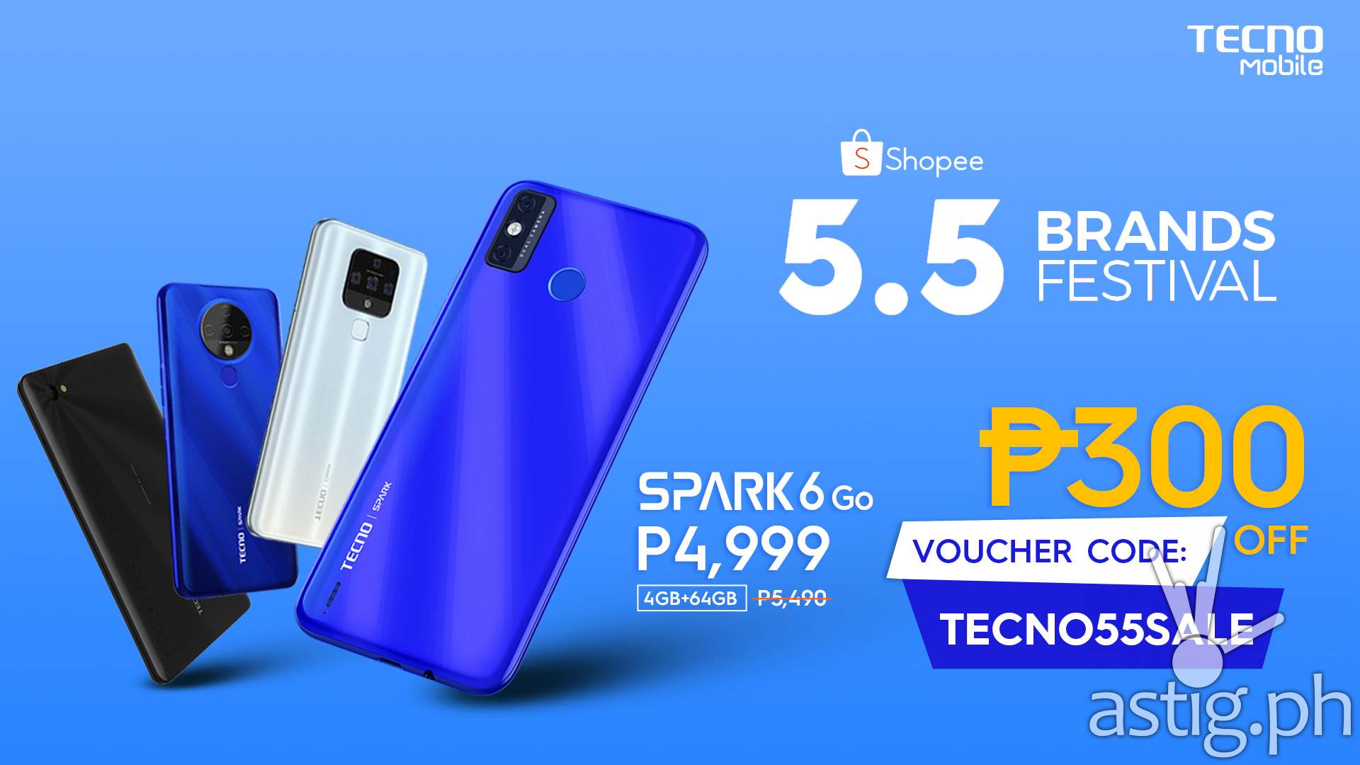 - On May 5, the first 200 buyers who use the code TECNO55SALE upon check out will get P300 off on their purchase, valid for any product. Another 600 buyers get P300 off when buying Spark 6 Go through Flash Sale.