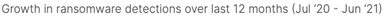 FortiGuard Labs data shows average weekly ransomware activity in June 2021 was more than tenfold higher than levels from one year ago. This demonstrates a consistent and overall steady increase over a year period. Attacks crippled the supply chains of multiple organizations, in particular sectors of critical importance, and impacted daily life, productivity, and commerce more than ever before. Organizations in the telecommunications sector were the most heavily targeted followed by government, managed security service providers, automotive, and manufacturing sectors.