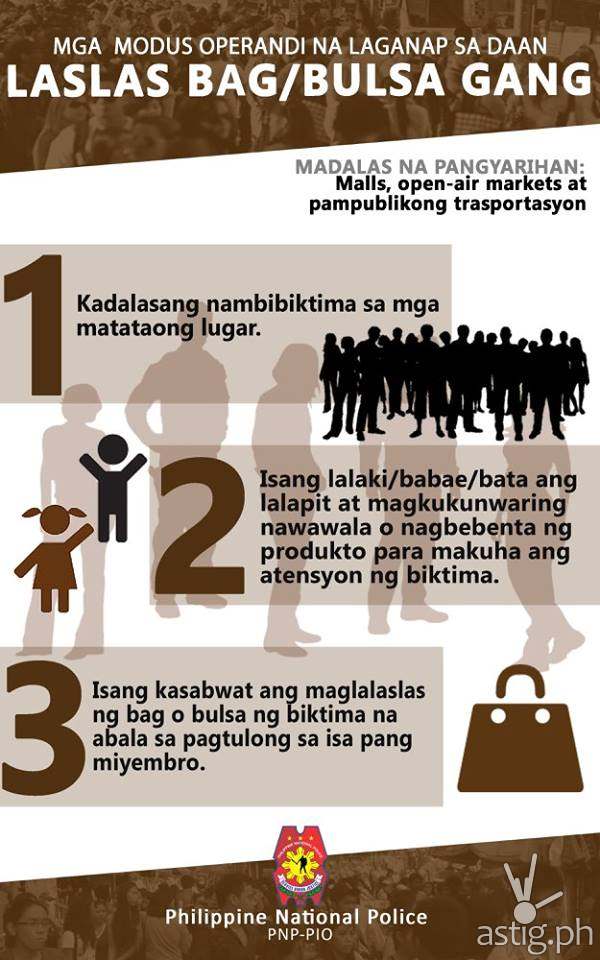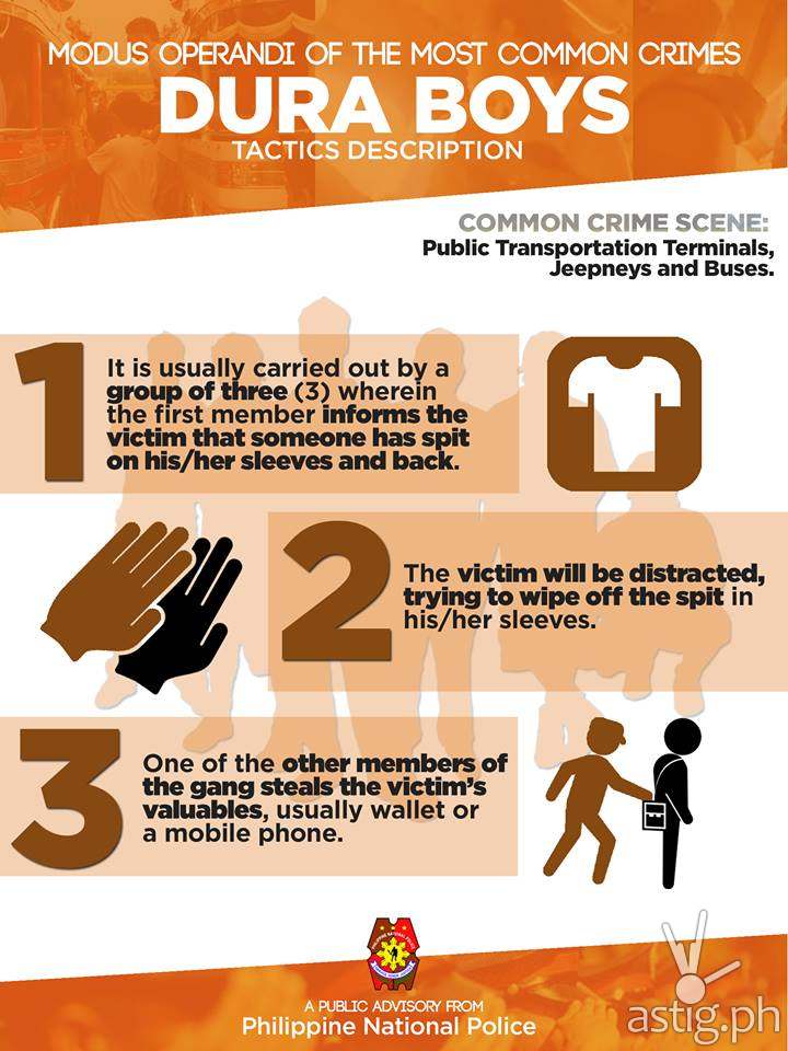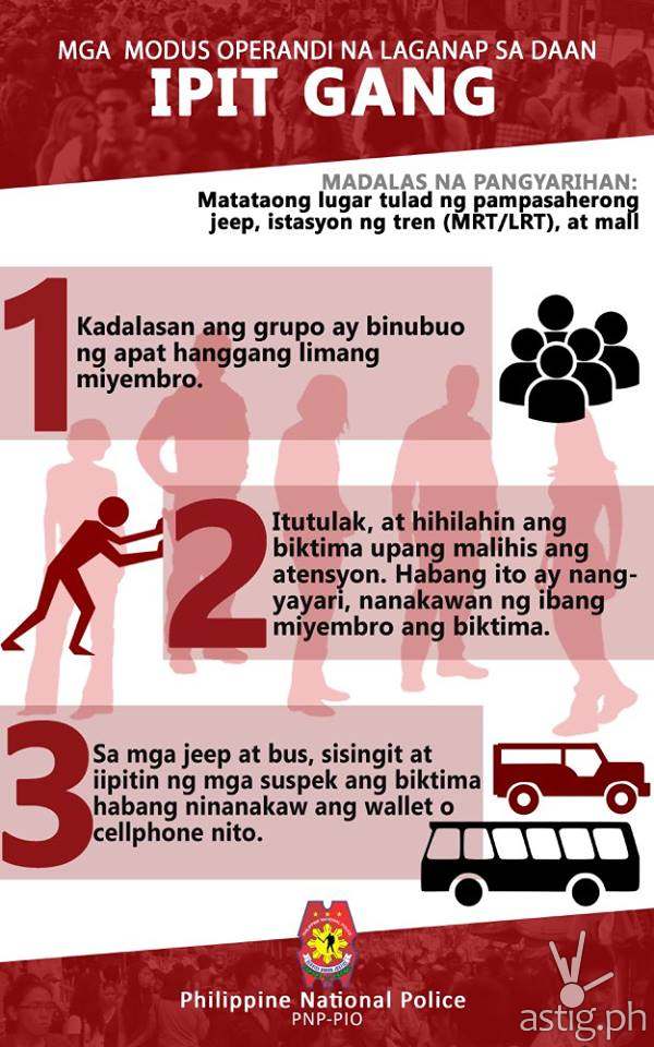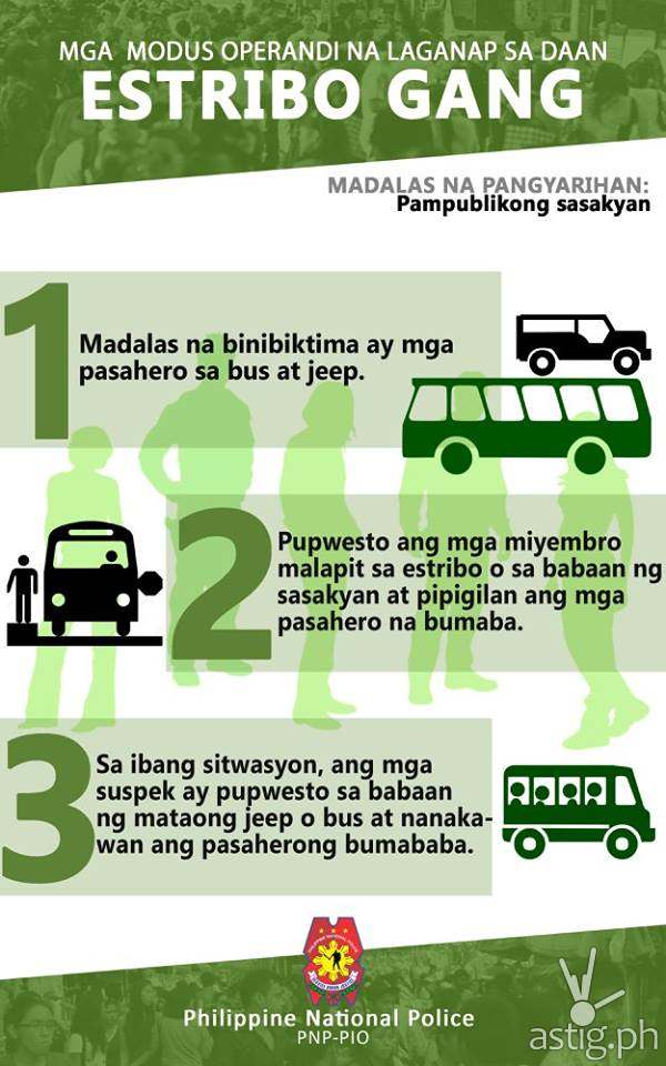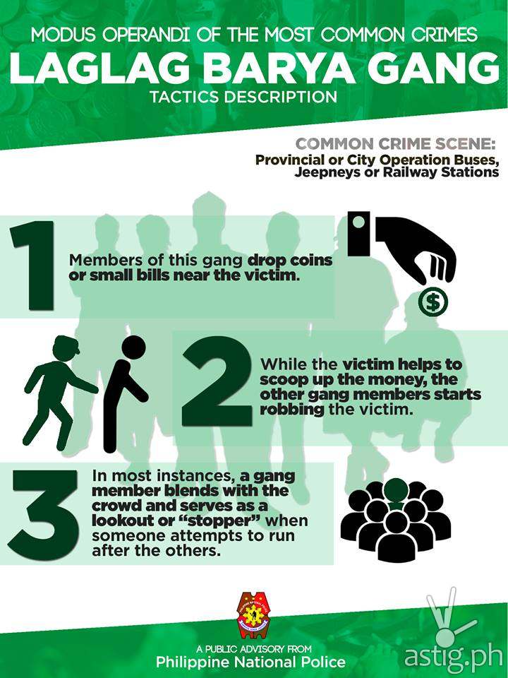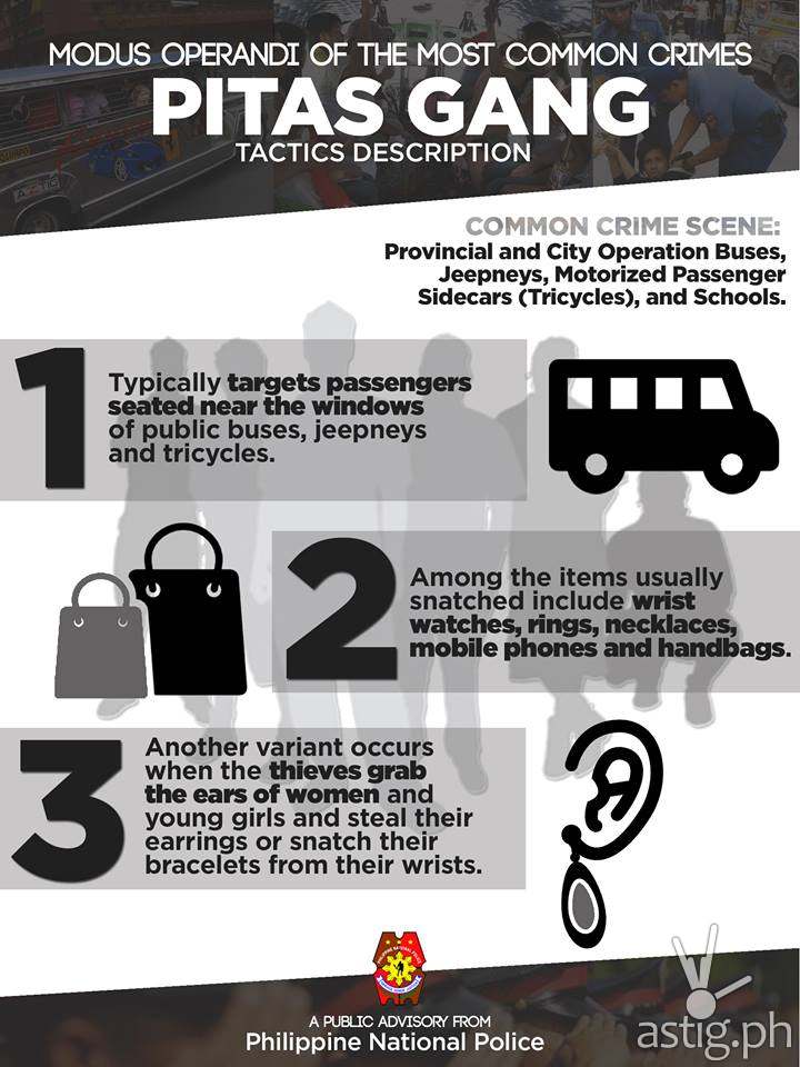 “The public must be informed of the modus operandi of criminal groups like Salisi Gang, Laglag-barya Gang, Besfren Gang, Tutok-Kalawit Gang, Ipit/Ipit-Taxi Gang, Laslas Bag/Bulsa, Estribo Gang, Dura Boys, and Pitas Gang, among others,” said the Philippine National Police (PNP).