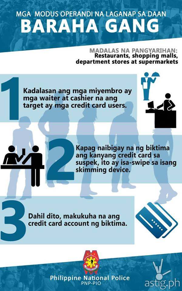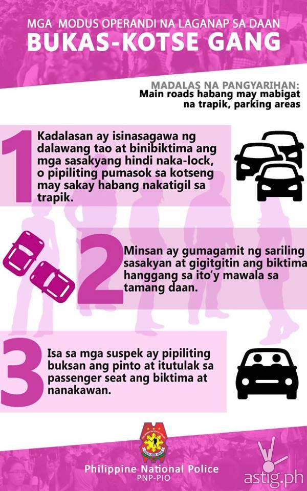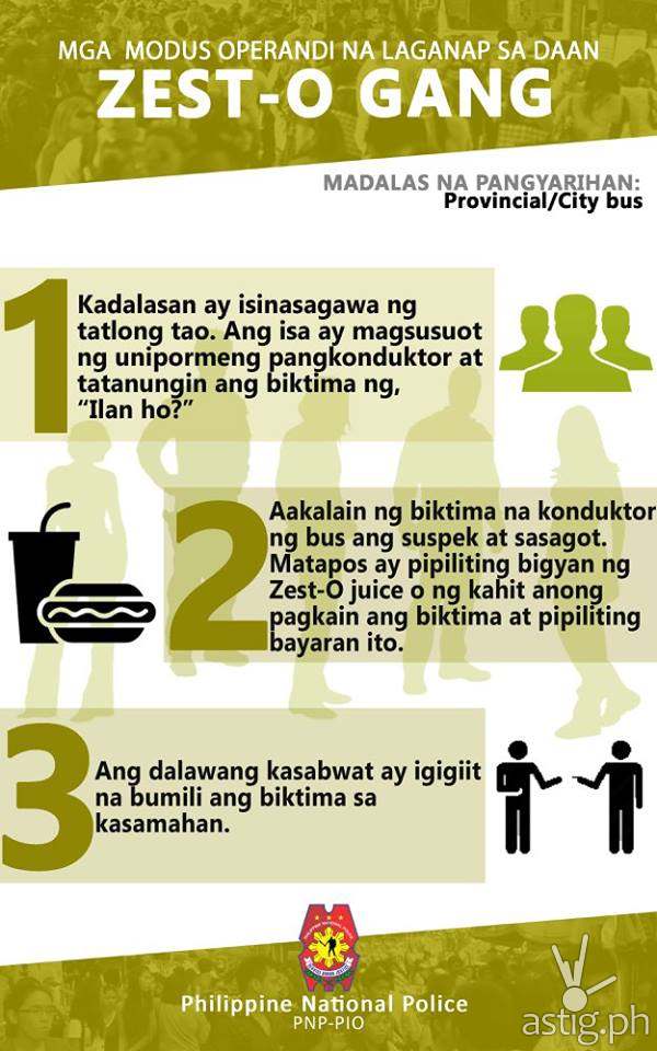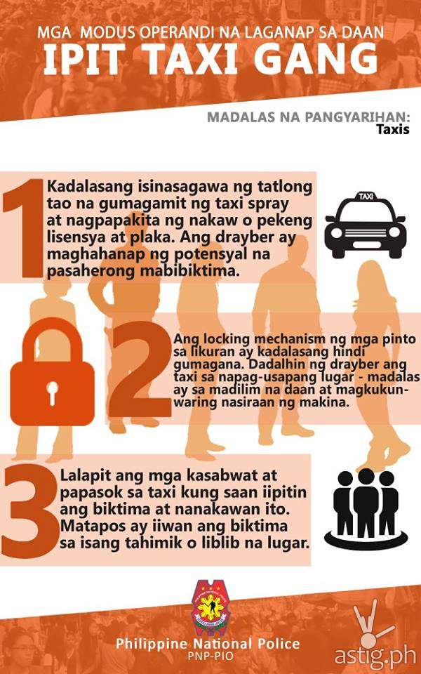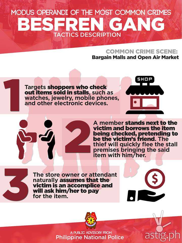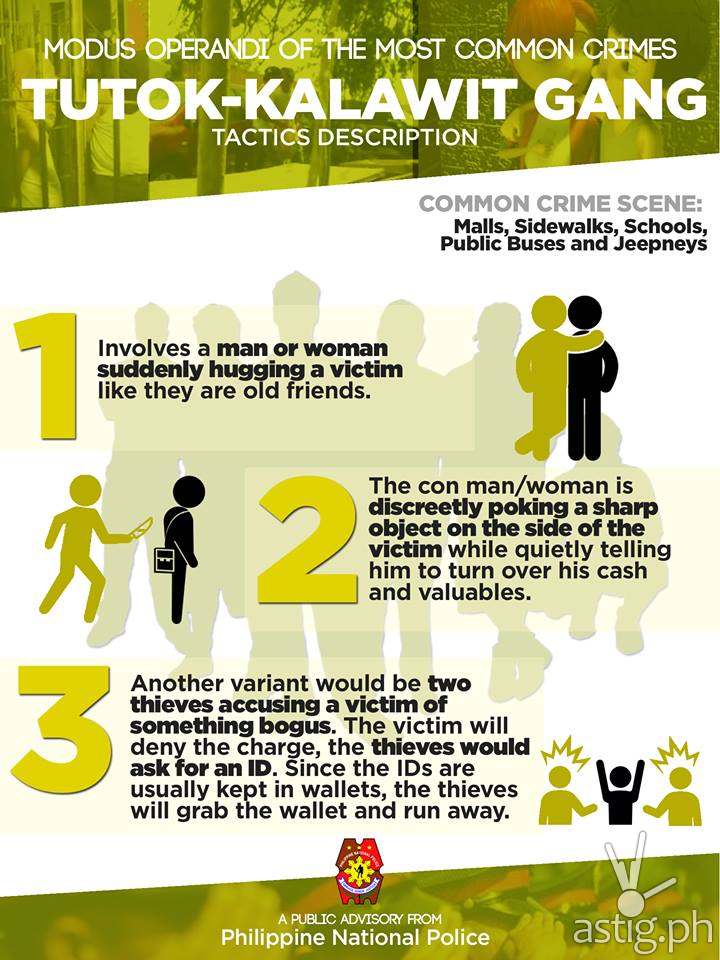 “The public must be informed of the modus operandi of criminal groups like Salisi Gang, Laglag-barya Gang, Besfren Gang, Tutok-Kalawit Gang, Ipit/Ipit-Taxi Gang, Laslas Bag/Bulsa, Estribo Gang, Dura Boys, and Pitas Gang, among others,” said the Philippine National Police (PNP).