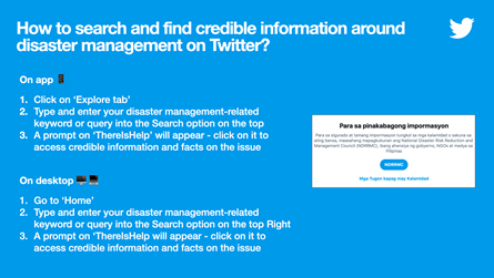 The search prompt is to amplify critical information and promote relief efforts either during or after disasters or emergencies with an objective to refer users to credible and reputable government agencies, NGOs and media providing updated information crisis response and disaster emergency. It is available on iOS, Android, and on mobile.twitter.com in Philippines; in both Tagalog and English languages.