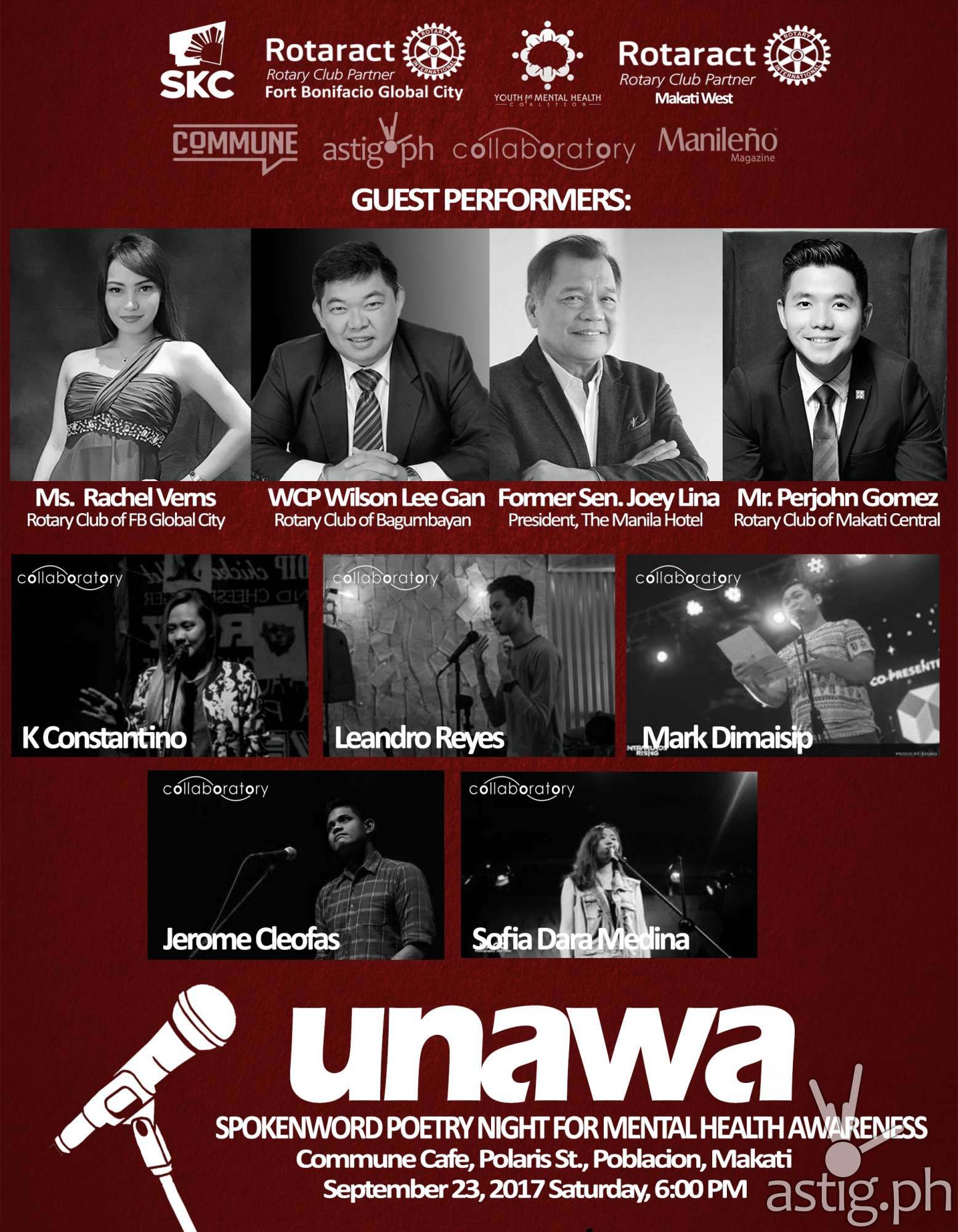 Rotaract Club of Fort Bonifacio Global City invites you to be a part of UNAWA: Spoken Word Poetry Night for Mental Health Awareness on September 23 at Commune Cafe+Bar in Makati.