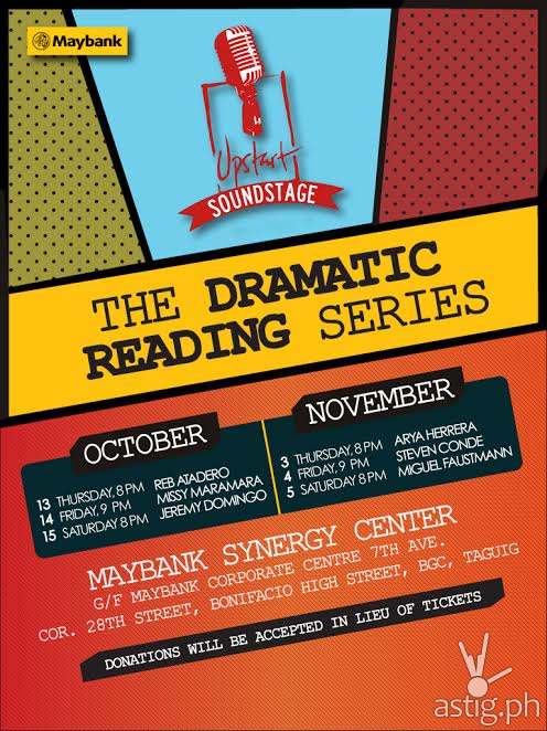 Upstart Soundstage: The Dramatic Reading Series is brought to you by Maybank. October 13 (8:00 pm), 14 (9:00 pm), and 15 (8:00 pm); November 3 (8:00 pm), 4 (9:00 pm), and 5 (8:00 pm) at the Maybank Synergy Center, G/F Maybank Corporate Centre, 7th Avenue corner 28th Street, Bonifacio High Street, BGC, Taguig. Donations will be accepted in lieu of tickets. Contact Upstart at 09178116156 or upstarttickets@gmail.com for more information