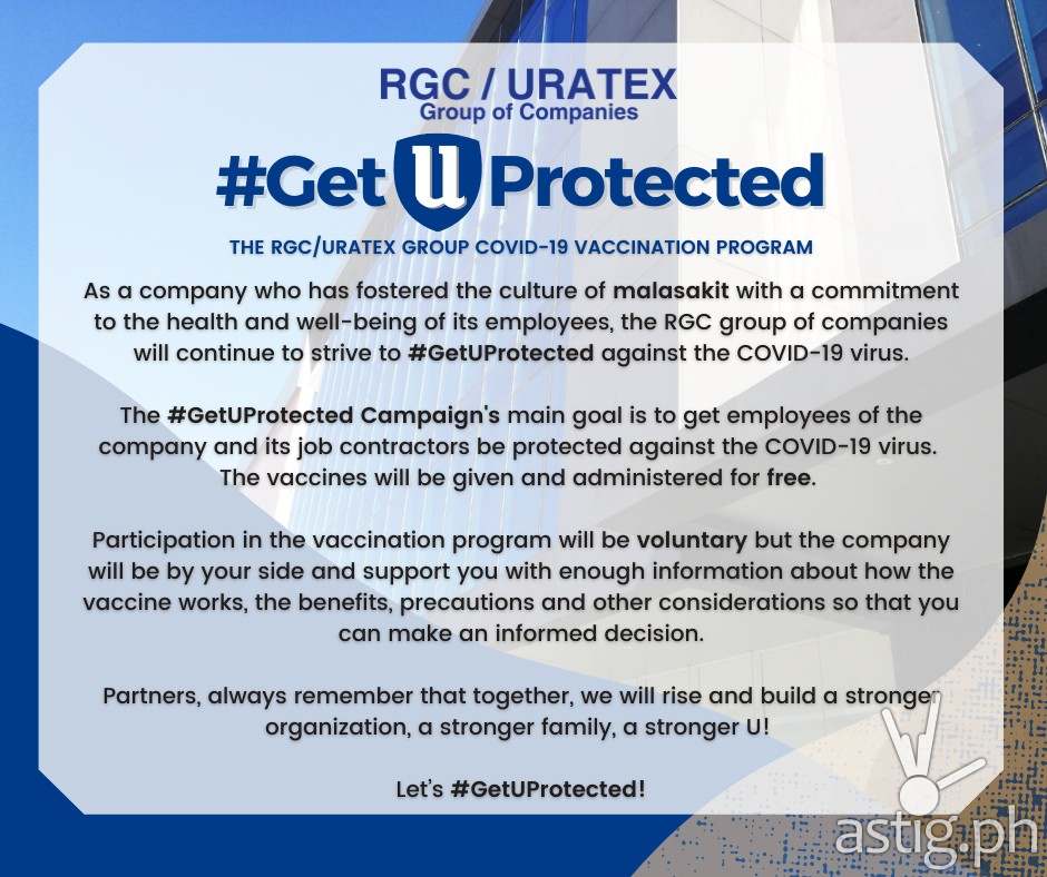 The RGC/Uratex Group of Companies launched #GetUProtected, a corporate-wide COVID-19 Vaccination Campaign, ensuring enough vaccines to cover all its workforce.