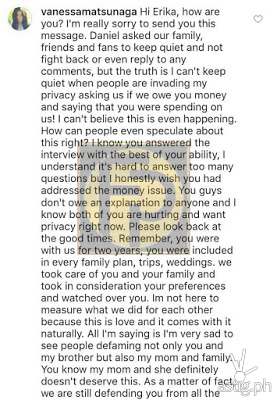 Vanessa Matsunaga, sister of Daniel Matsunaga appealed to Erich Gonzales to address the issue of money revolving around the recent controversial break up of Be My Lady stars Daniel and Erich.