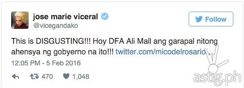 “This is DISGUSTING!!! Hoy DFA Ali Mall ang garapal nitong ahensya ng gobyerno na ito!!!” Vice Ganda tweeted after seeing the tweet of a Star Cinema’s executive.