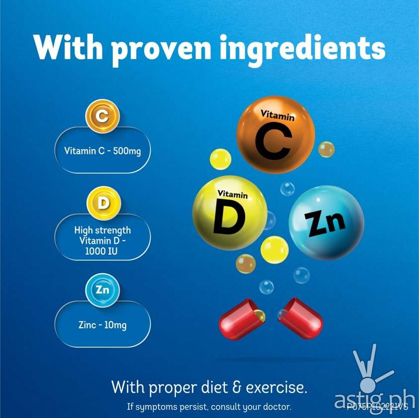 Our immune system naturally protects us against illnesses, so it’s important that we continuously support it to help keep it functioning smoothly. Vitamin C and Zinc have long been known to help boost the immune system. Vitamin D, on the other hand, has gained popularity recently due to discoveries about its key role in innate immunity, which is the body’s frontline response to novel pathogens. Vitamin D helps regulate the production of harmful substances and modulates our body’s response to inflammation, thus helping our immune system fight infections. These 3 ingredients found in Ascorbic Acid + Zinc + Cholecalciferol (Vicks Immune Defense) work synergistically to help provide 3-in-1 immune defense, along with proper diet and exercise.