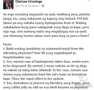 Sa mga siraulong nagsasabi na epal, mukhang pera, pabebe, tanga etc. yung nakainom ng kapeng may bubwit, FYI full-blown po ang nakuha nyang leptospirosis from it. Walang nakakaalam kung paano napasok yung sa daga sa kape, pero sige nga, sino na namang baliw ang maglalagay nun sa sarili nya mismong inumin sabay inom para lang sa pera o fame?