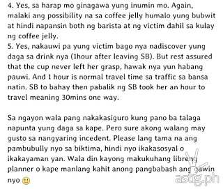 4. Yes, sa harap mo ginawa yung inumin mo. Again, malaki ang possibility na sa coffee jelly, humalo yung bubwit at hindi napansin both ng barista at ng victim dahil sa kulay ng coffee jelly.