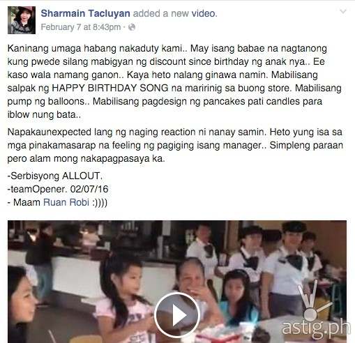 On her Facebook, branch manager Sharmain Tacluyan shared how they were initially asked by the girl’s mother for a discount as it was her birthday.
