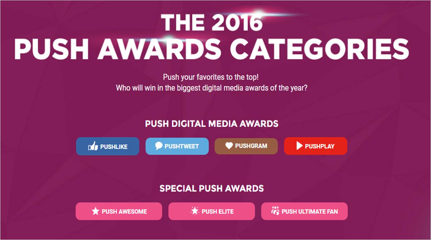 To vote, just log in to PushAwards.com and register using your Facebook account. Only one vote per category will be accepted per day.