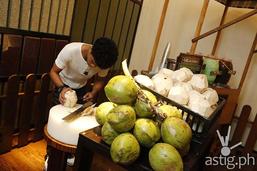 Marriott Café’s ‘Samalamig Station’ serves Melon, Gulaman, and Buko Pandan “at the corner of Kalaw Avenue and UN Avenue” where heaps of fresh buko are also on display.