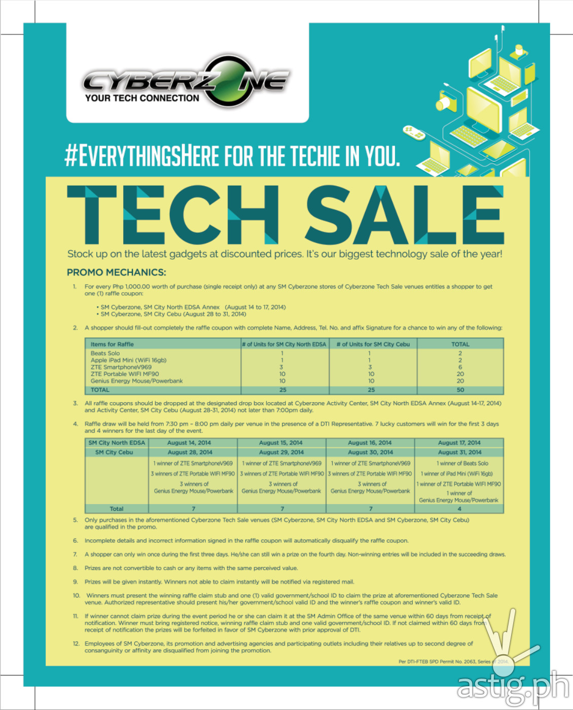 SM Cyberzone is giving away Beats Solo and an Apple iPad Mini in the biggest technology sale of the year. For every 1,000 peso purchase made from August 14 to 17, 2014 lucky shoppers in SM North EDSA and SM City Cebu be entitled to a chance to win these gadgets.